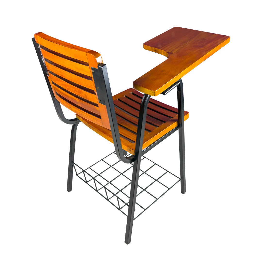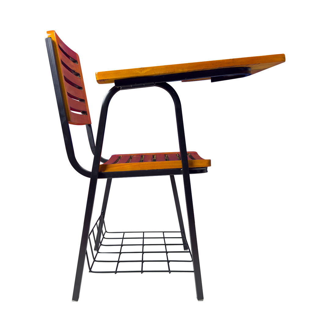 A durable and comfortable classroom chair designed with a strong steel frame, smooth wooden writing pad, and an ergonomic seat—perfect for schools, colleges, coaching centers, and training rooms.